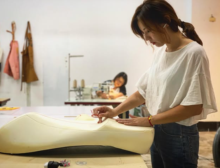 Beyond furniture, Darrel’s talents extend even further. In addition to designing for Qbit, she also works with Kingsman Seat, a brand specializing in handcrafted leather bike and car seats, where precision and artistry come together.